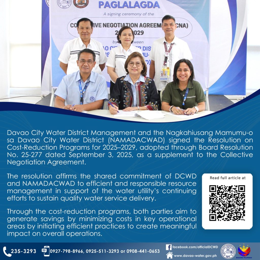 Davao City Water District Management and the Nagkahiusang Mamumu-o sa Davao City Water District (NAMADACWAD) signed the Resolution on Cost-Reduction Programs for 2025–2029, adopted through Board Resolution No. 25-277 dated September 3, 2025, as a supplement to the Collective Negotiation Agreement (CNA).
