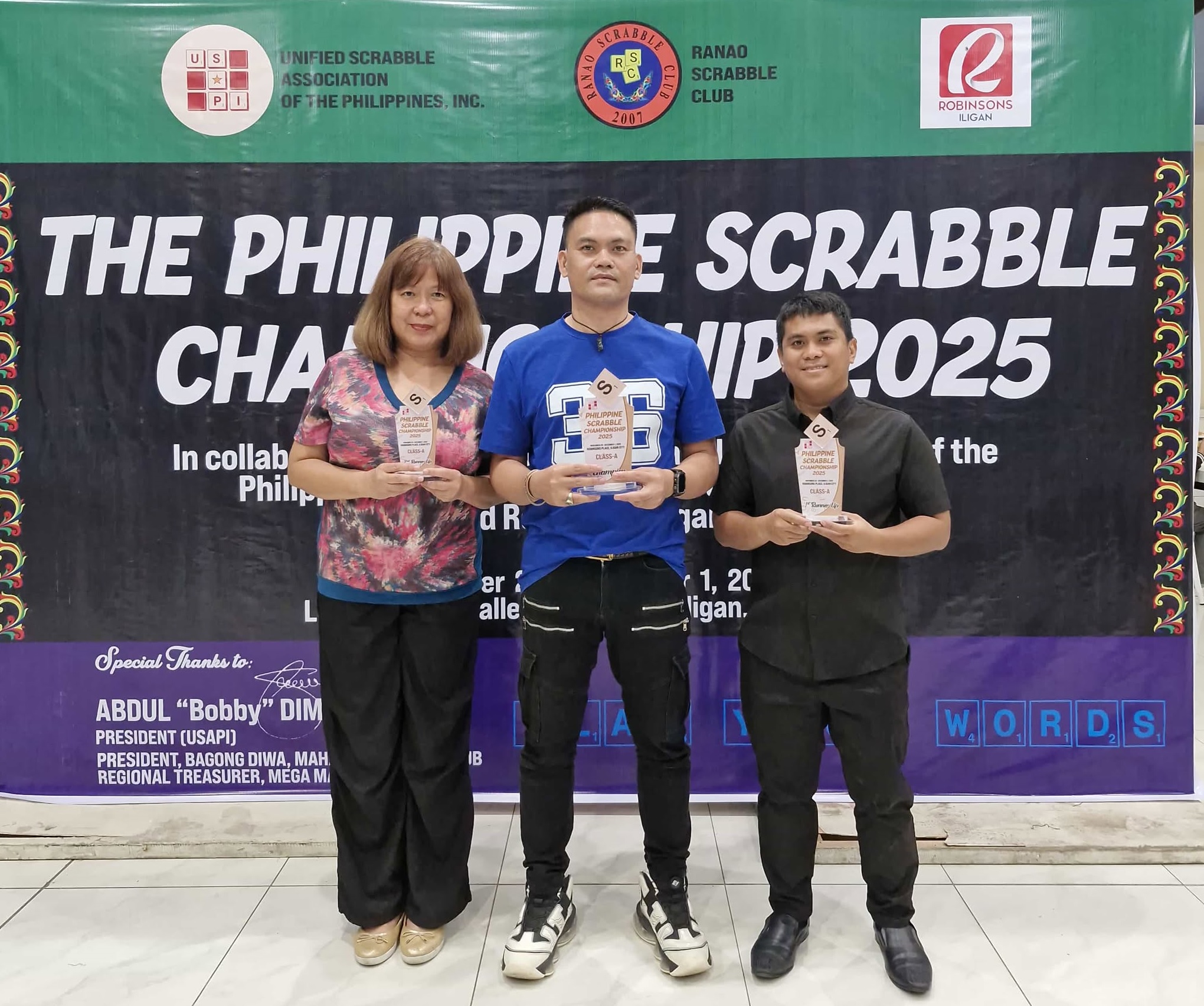 In the general assembly meeting, Abdul “Bobby” Dimakuta Suma was re-elected as national president of the Unified Scrabble Association of the Philippines (USAPI) while Lear Jet Dela Cruz has been retained as tournament director.