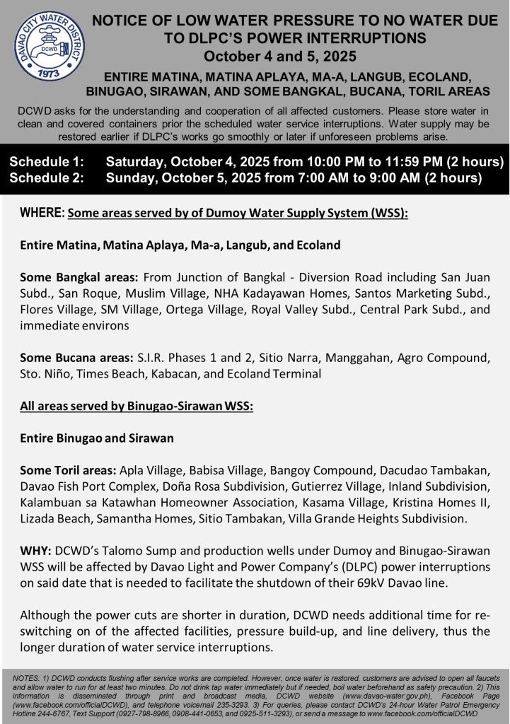 BUSINESSNotice of Low Water Pressure to No Water Due to DLPC’s Power Interruptions on October 4 and 5, 2025 mj_adminOctober 3, 2025October 13, 202501 mins Post navigation Previous: SSS-Davao branch flags P12.9-M delinquencies from employers as of Sept.Next: Time running out on ICC, BBM (GUEST COLUMNIST by Chito A. Fuentes) Leave a Reply Cancel replyYour email address will not be published. Required fields are marked *Comment * Name * Email * Website Save my name, email, and website in this browser for the next time I comment.