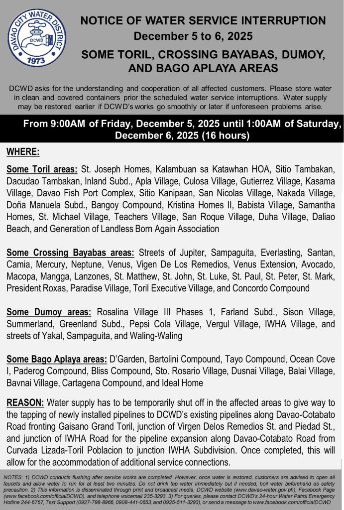 BUSINESSNotice of Water Service Interruption on December 5 to 6, 2025 in some Toril, Crossing Bayabas, Dumoy, and Bago Aplaya areas mj_adminDecember 4, 2025December 4, 202501 mins Post navigation Previous: Martus dominates 2025 national scrabble edition Leave a Reply Cancel replyYour email address will not be published. Required fields are marked *Comment * Name * Email * Website Save my name, email, and website in this browser for the next time I comment.