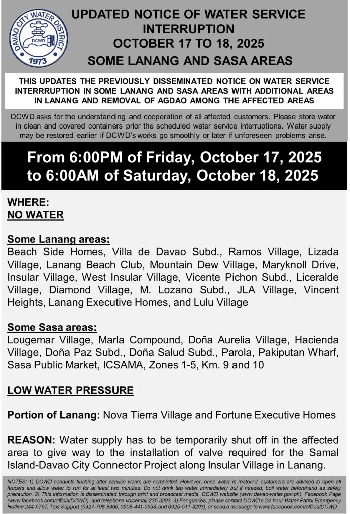 BUSINESSUpdated Notice of Water Service Interruption on October 17-18, 2025 mj_adminOctober 16, 2025October 16, 202501 mins Post navigation Previous: DCWD SANITATION SERVICE 101ππ ππ§π¨π§π π€π’π§ππ‘ππ§π π₯ππ§ ππ§π ππππ πππ§π’ππππ’π¨π§ πππ«π―π’ππ?Next: More than a coffee shop Leave a Reply Cancel replyYour email address will not be published. Required fields are marked *Comment * Name * Email * Website Save my name, email, and website in this browser for the next time I comment.